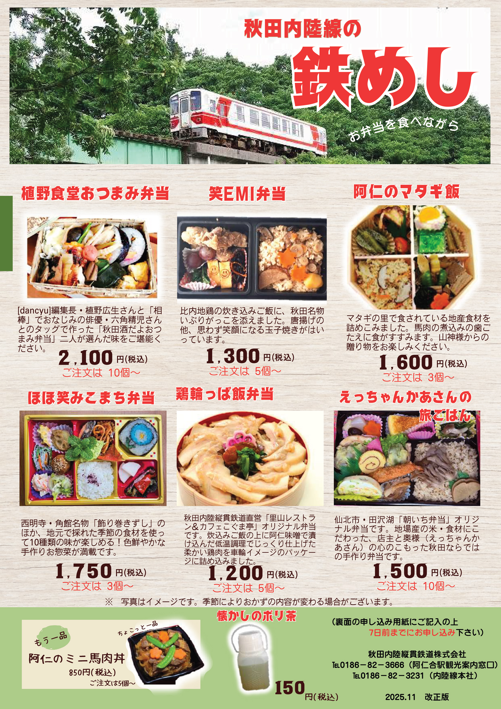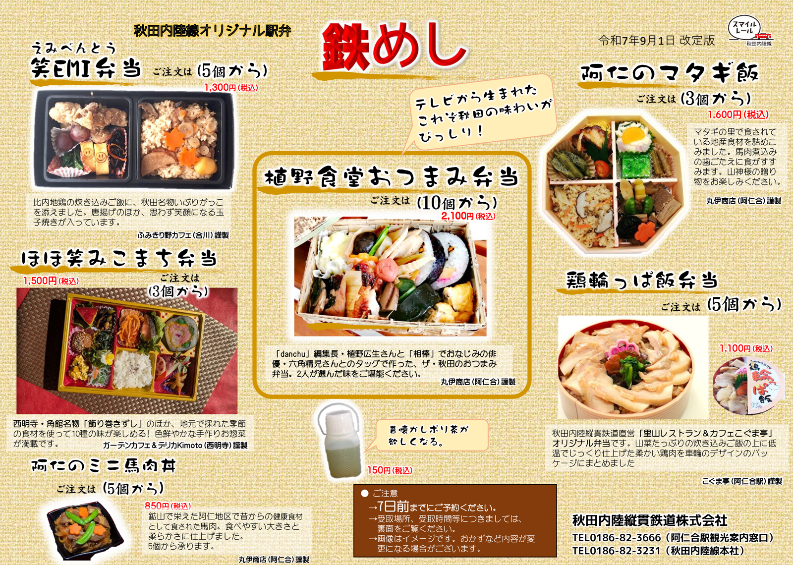 地元密着を第一に「愛され、親しまれるおもてなし」をテーマに、地場産品に拘りながら「秋田らしさ」「北秋田市・仙北市沿線ならでは」の食材で揃えたメニューを提供しています。ここならではのお料理と列車・車窓の眺めをごゆっくりご堪能下さい。