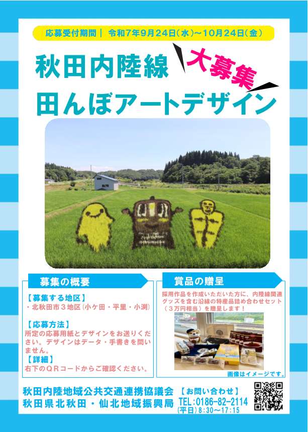 このたび、秋田内陸線により愛着を持っていただくため、令和8(2026)年度に沿線3か所で制作する絵柄のデザイン案を募集中です。なお、田んぼアートに適したデザインとするため、採用作品を編集・加工する場合があります。