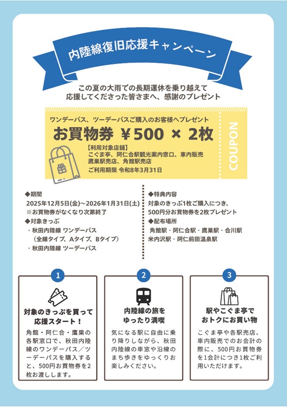 期間中、秋田内陸線のワンデーパス、ツーデーパスをご購入のお客様を対象に、内陸線各施設でご利用いただけるお買物券を進呈いたします。
